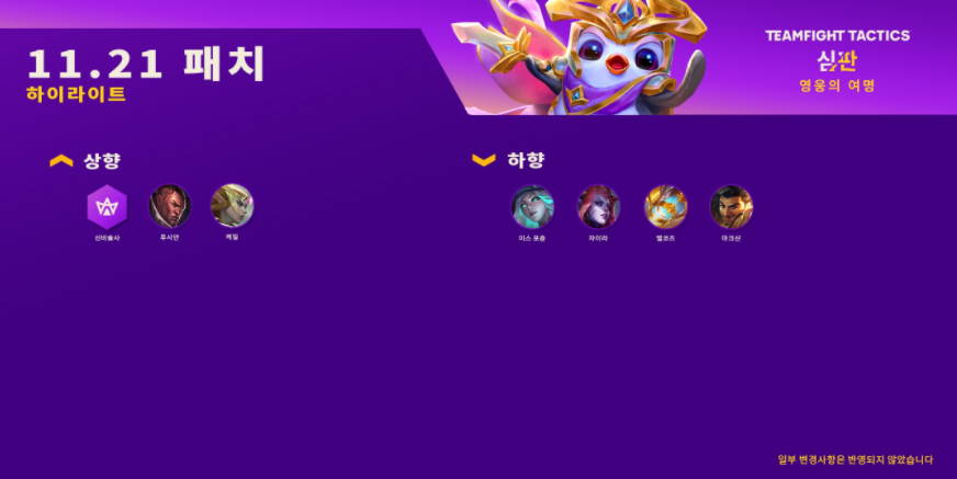 이번 시간에는 롤토체스(전략적 팀 전투) 11.21 패치노트에 대해서 알아보도록 하겠습니다. 이번 패치는 지난 11.20 패치와는 달리 그렇게 큰 변화는 없으며 간단간단한 특성 변경점과 챔피언 변경점만 있습니다. 그렇다면 과연 이번 11.21 패치에서는 어떤 특성이 어떻게 변화하였고 또 어떤 챔피언이 어떻게 변경되었는지 살펴봅시다.