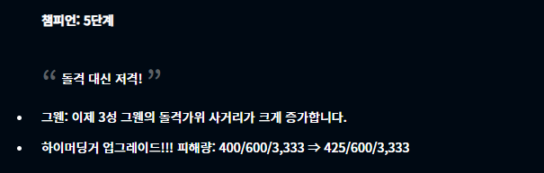 3성 뽀삐, 3성 신드라 스킬 데미지가 버프되었고 3성 자이라, 3성 미스 포츈의 경우 스킬 데미지가 너프되었습니다. 또한 1성, 2성 벨코즈 스킬 데미지가 너프되었고 루시안의 경우 기본 공격력이 너프되었으며 아크샨은 체력이 감소, 케일은 버프되었습니다. 3성 그웬의 경우 스킬 사거리가 크게 증가하였으며 1성 하이머딩거는 스킬 데미지가 증가했습니다.