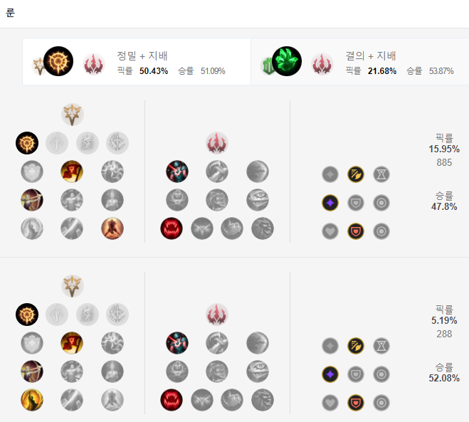 티모는 평타 기반 챔피언이기에 정밀에서 집중 공격을 메인 룬으로 사용합니다. 하위 룬으로는 승전보, 전설: 민첩함, 최후의 저항을 들어주시고 보조룬으로는 비열한 한 방과 굶주린 사냥꾼을 들어주면 되겠습니다.