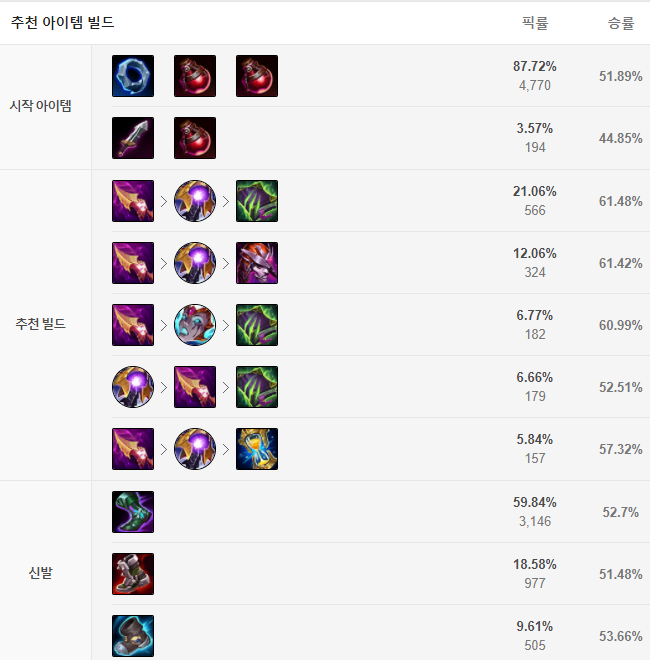 처음 시작은 도란의 반지와 포션 두 개로 시작해줍니다. 이후 첫 번째 코어 아이템으로 신화템이 아닌 내셔의 이빨을 먼저 올려주는게 좋으며 마법사의 신발도 올려줍니다. 그러고 난 뒤 균열 생성기를 올려주시고 그 이후로는 상황을 보면서 상대팀에 회복, 흡혈 능력이 강하면 모렐로노미콘을, 그게 아니라면 악마의 포옹을 올려줍니다. 그러고 나서는 딜이 필요하면 라바돈의 죽음 모자, 상대가 마저템을 많이 둘렀다면 공허의 지팡이, 스킬가속과 이동속도가 더 필요하면 우주의 추진력, 한타때 계속 먼저 짤린다면 존야의 모래시계 이렇게 상황에 맞게 템을 올려주면 되겠습니다.