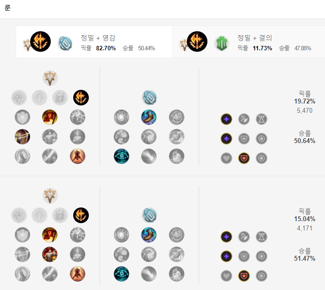 주 룬으로는 정복자를 주로 사용하는데요, 스킬과 평타를 이용하여 빠르게 정복자를 터뜨릴 수 있습니다. 승전보 룬은 거의 고정이며 전설 룬 가운데서는 민첩합을 많이 드는데 위에서 설명드렸던 평캔을 더 잘 하는데 도움이 되기 때문이죠. 또한 브루저답게 최후의 저항 룬이 자주 사용됩니다. 보조 룬으로는 영감에서 마법의 신발과 우주적 통찰력을 들어주어 더 더 빠른 이동속도와 최대 쿨감 45%를 맞춰 노코스트 챔피언의 효율을 제대로 뽑아먹을 수 있습니다.