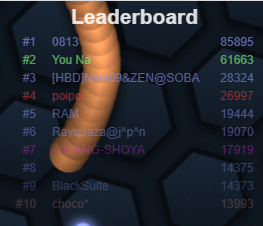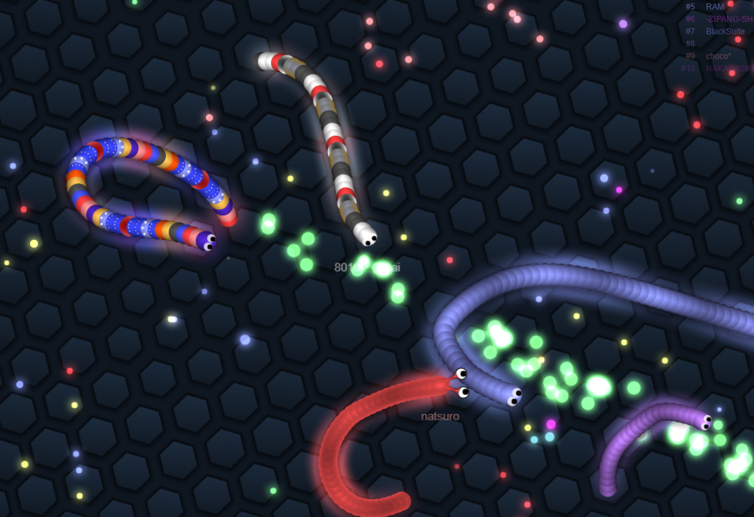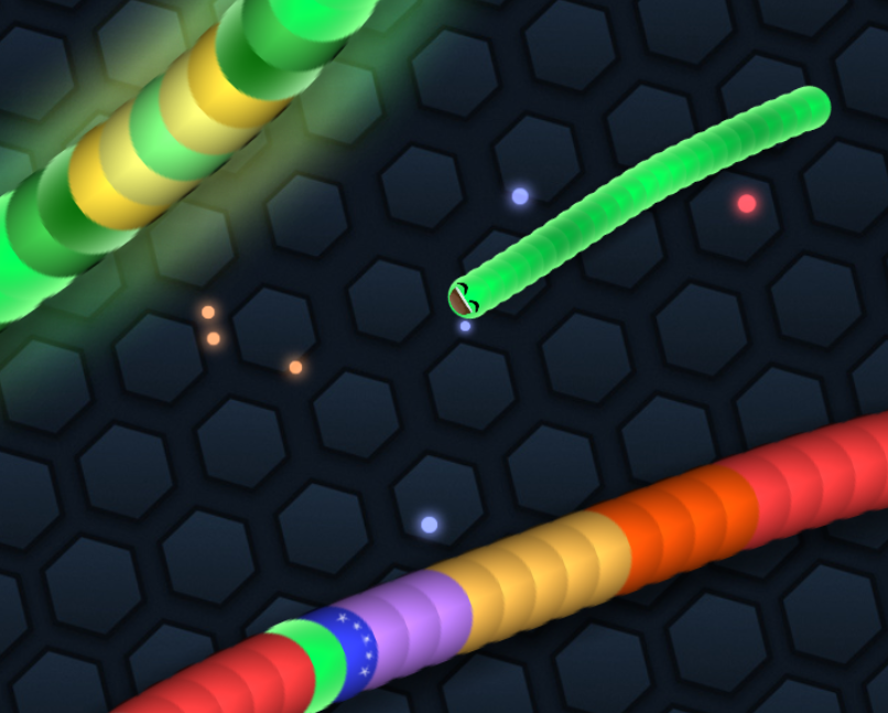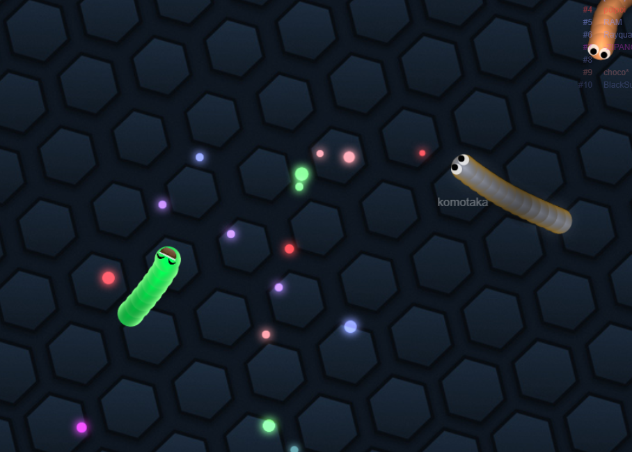 그렇게 지렁이를 움직이면서 서로 경쟁하는 게임으로, 만약 자신의 지렁이의 머리 부분이 다른 지렁이의 몸에 닿게 되면 그 즉시 게임은 끝납니다. 또 지렁이가 다른 지렁이와 부딪혀 죽게 되면 일반 동그라미들보다 더 크고 빛나는 동그라미들로 나뉘는데 먹으면 더 많은 점수를 주기에 일부러 상대방 지렁이를 자신의 몸통에 부딪혀 죽게하는 플레이도 많습니다.