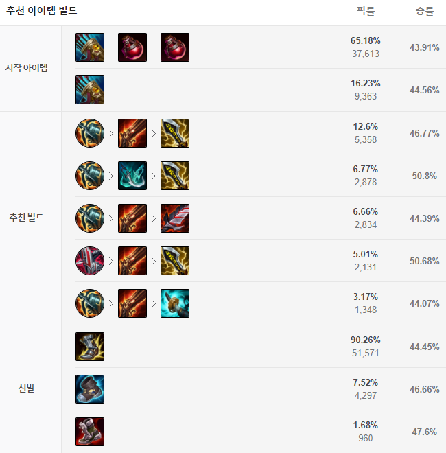 칼바람 트타 템트리의 경우 절정의 화살과 포션 두 개로 시작해주고 가장 무난한 빌드는 크라켄 - 고속 연사포 - 무한의 대검 템트리입니다. 신발의 경우 광전사의 군화를 첫 코어 아이템을 띄운 뒤 올려주시면 됩니다. 그 후에는 상황을 보고 피흡이 필요하면 피바라기, 딜링이 더 필요하다면 폭풍 갈퀴, 치유 감소 효과가 필요하다면 필멸자의 운명 등을 유동적으로 올려주면 됩니다.