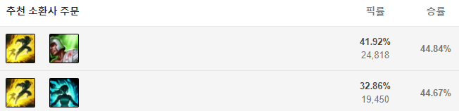 스펠은 점멸과 회복을 들어주거나 혹은 점멸과 정화를 들어줍니다. 정화를 잘 사용할 줄 아는 분이라면 정화를, 그게 아니라면 무난한 회복을 들어주는게 좋습니다.