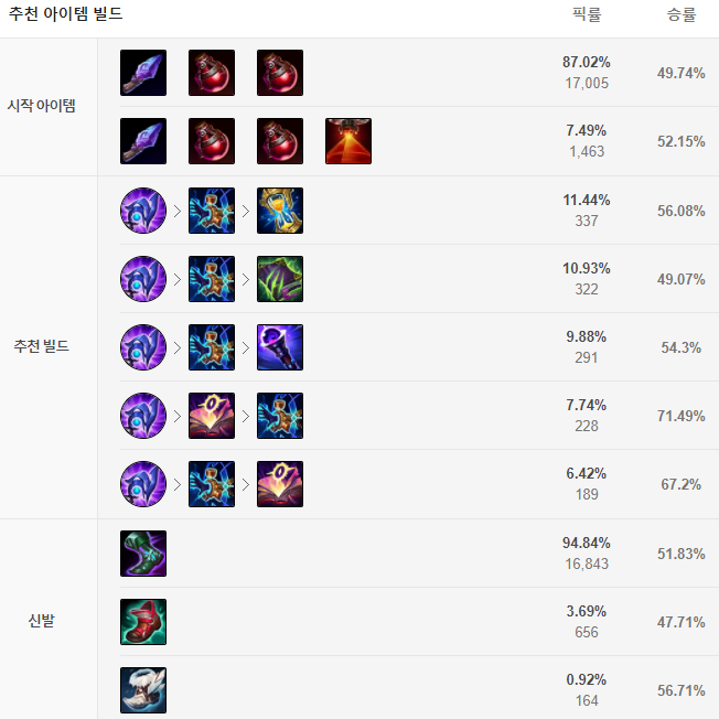 서폿 제라스지만 템트리는 미드 제라스와 마찬가지입니다. 처음 시작에만 주문도둑의 검과 포션 두 개를 구매해주시고 이후 첫 코어 아이템으로는 루덴의 메아리를 띄워줍니다. 그 후 마법사의 신발을 올린 뒤 지평선의 초점까지는 고정으로 올려주고 상황을 보면서 생존력이 필요하면 존야의 모래시계, 피흡이나 회복 능력이 상대팀에 많은 경우 모렐로노미콘, 상대팀이 마법 저항력 아이템을 많이 올린 경우 공허의 지팡이를 올려주시면 됩니다. 그 외에도 자신이 엄청 흥했거나 하면 라바돈의 죽음 모자도 괜찮은 선택지며 첫 코어 아이템을 띄우기 전에 암흑의 인장을 구매해준 뒤 스택이 쌓이면 메자이로 바꿔주는것도 좋은 방법입니다.