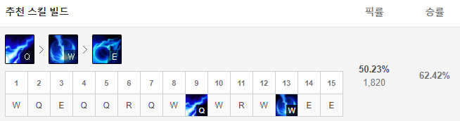 1레벨에는 W를 찍어서 정글 리쉬가 끝난 뒤 라인전에 복귀해서 허겁지겁 근거리 CS를 챙기는 상대 원딜에게 맞춰줍시다. 그 후 2레벨에는 Q, 3레벨에는 E스킬을 찍어주고 4레벨부터는 R-Q-W-E 순서로 스킬을 마스터해주면 되겠습니다.