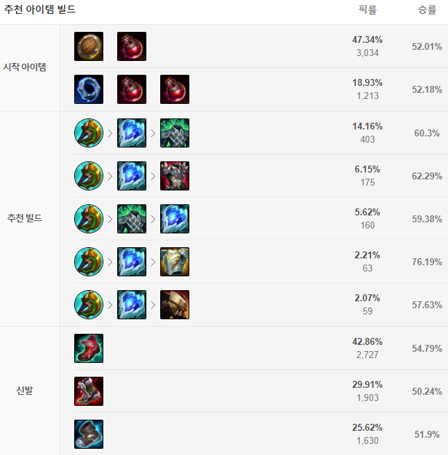 처음 시작은 버티기 좋은 도란의 방패로 시작해줍니다. 이후 첫 코어 아이템으로 신성한 파괴자를 올려주고 신발은 스택을 더 빨리 쌓기 위해 스킬 가속을 올려주는 아이오니아의 신발을 올려줍니다. 그 후 상대가 AD라면 얼어붙은 심장을 먼저 정령의 형상을 나중에, AP라면 정령의 형상을 먼저 올려주고 얼어붙은 심장을 나중에 올려주면 됩니다. 이후에는 상황을 보고 가시 갑옷, 가고일 돌갑옷, 망자의 갑옷 등을 올려주시면 됩니다. 신발도 극후반에는 바꿔주는게 좋구요.