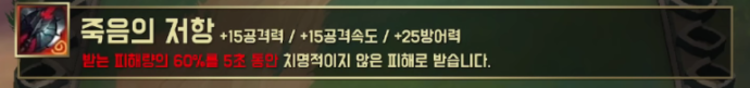공격력 15, 공격 속도 15, 방어력 25를 올려주며 받는 피해량의 60%를 5초 동안 치명적이지 않은 피해(기본 피해)로 전환시킵니다.