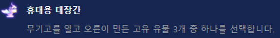 설명을 살펴보면 무기고를 열고 오른이 만든 고유 유물 3개 중 하나를 선택한다고 되어있습니다. 저는 처음에는 단순히 완성된 아이템을 하나 선택하는 그런 것인줄 알았으나 실제로 휴대용 대장간 증강체를 선택해보니 전혀 새로운 아이템이 나온다는 것을 알게 되었습니다. 리그오브레전드에서도 오른은 대장장이 컨셉으로 아군들의 아이템을 업그레이드 시켜줄 수 있는데요, 그런 느낌으로 일반적으로는 얻을 수 없는 강화된 아이템들이 등장하고 그중 하나를 고르는 것이죠.