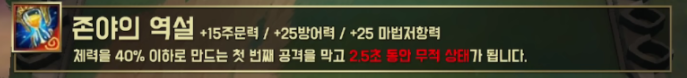 주문력 15, 방어력 25, 마법 저항력 25를 올려주며 체력이 40% 이하로 만드는 첫 번째 공격을 막고 2.5초 동안 무적 상태가 됩니다.