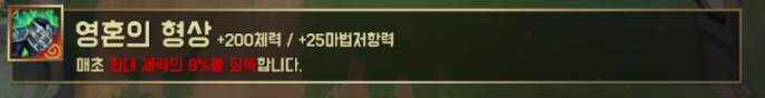 체력 200, 마법 저항력 25를 올려주며 매 초 최대 체력의 8%를 회복합니다.