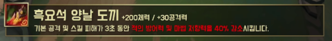 체력 200, 공격력 30을 올려주며 기본 공격 및 스킬 피해가 3초동안 적의 방어력, 마법 저항력을 40% 감소시킵니다.