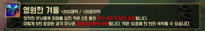 체력 200, 방어력 25를 올려주며 장착한 유닛에게 피해를 입힌 적은 2초동안 공격 속도가 50% 둔화되고 이렇게 5번 둔화된 공격 유닛은 둔화 지속시간동안 속박됩니다. (쿨타임 10초)