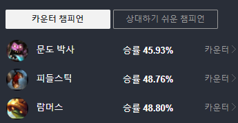 문도의 경우 1~2코어가 나오게 되는 경우 서로가 서로를 잡기 힘든 구도가 나옵니다. 헤카림은 열심이 열심히 때려도 문도는 궁극기를 통해 체력을 다시 회복시키면서 딜을 넣고, 반대로 헤카림은 위험하다 싶으면 스킬을 써서 싸움에서 도망갈 수 있죠. 이러한 것들 외에도 사실 초반부에 카정을 많이 오는 정글러에게 조금 약한 편입니다. 헤카림이 초반에 그렇게 강력한 챔피언이 아니고, E스킬을 이용해 갑자기 들어갔을 때 높은 딜링이 나오는 거지 반대로 급습당했을때는 그렇게 강하지 않은 편이기 때문이죠.