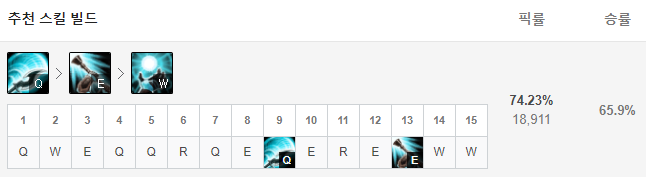 1레벨에는 Q를, 2레벨에는 W를 찍어서 1레벨에는 바텀 리쉬와 함께 버프몹을 잡고 2레벨에는 그 외 정글들을 W를 사용하면서 잡음으로서 안정적인 피 관리를 할 수 있습니다. 3레벨에는 E를 찍어주고 그 이후부터는 R-Q-E-W 순서로 스킬을 마스터해주시면 됩니다.