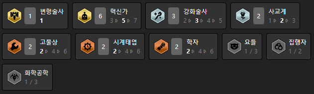 보면 알 수 있겠지만 혁신가 유닛을 전부 모아도 여섯 마리밖에 되지 않아 혁신가(7) 시너지를 챙길 수가 없습니다. 그렇기 때문에 아까 말했다시피 증강체로 이 부분을 매꾸는 것이죠. 증강체로 혁신가를 하나 매꾸었을 때 완성되는 시너지는 변형술사(1), 혁신가(7), 강화술사(3), 사교계(2), 고물상(2), 시계태엽(2), 학자(2) 시너지입니다.