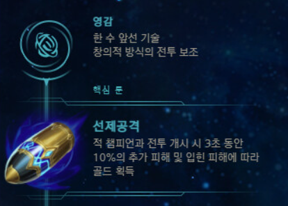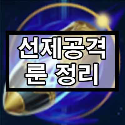 선제공격 룬은 적 챔피언 1명에게 기본 공격이나 스킬로 피해를 입기 전 또는 전투 시작 후 0.25초 내에 해당 적 챔피언에게 기본 공격이나 스킬로 피해를 입히면 5골드를 획득하고 이후 3초 동안 선제공격 효과를 얻어 자신의 기본 공격이나 스킬이 모든 챔피언에게 12%의 추가 피해를 입히며 입힌 추가 피해량만큼(근접 챔피언 100% / 원거리 챔피언 70%) 골드를 획득합니다. 재사용 대기시간은 25초~15초로 레벨에 따라 점차 감소합니다. 즉 핵심은 전투 시작 후 먼저 공격을 가하면 5골드 획득, 그리고 이후 3초동안 12% 추가 피해를 입히는데 이 추가 피해량만큼 골드를 획득하는 것입니다.