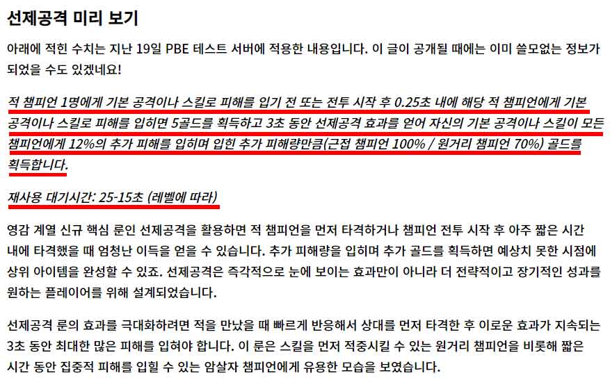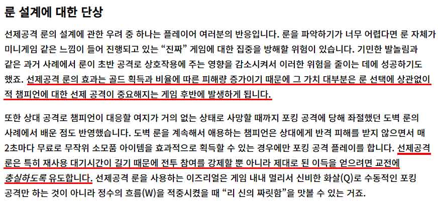 제작진도 마찬가지로 이와 관련해서 언급한게 선제공격 룬의 효과는 골드 획득과 비율에 따른 피해량 증가이기 때문에 그 가치 대부분은 룬 선택에 상관없이 적 챔피언에 대한 선제 공격이 중요해지는 게임 후반에 발생하게 된다고 말을 했고 더불어 재사용 대기시간이 길기 때문에 전투 참여를 강제할 뿐 아니라 제대로 된 이득을 얻으려면 교전에 충실하도록 유도한다고 했죠. 결코 과거의 도벽룬처럼 치사하고 더럽진 않을 것이라는게 제 생각입니다.