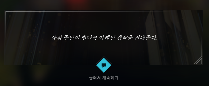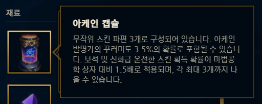 그러면 상점 주인이 빛나는 아케인 캡슐을 건네줍니다. 이렇게 되면 빛나는 아케인 캡슐을 획득한 것으로 이제 게임에 들어가서 제작소를 보면 '아케인 캡슐'이 있는 것을 확인할 수 있습니다. 아케인 캡슐에서는 스킨 조각 3개가 등장합니다.