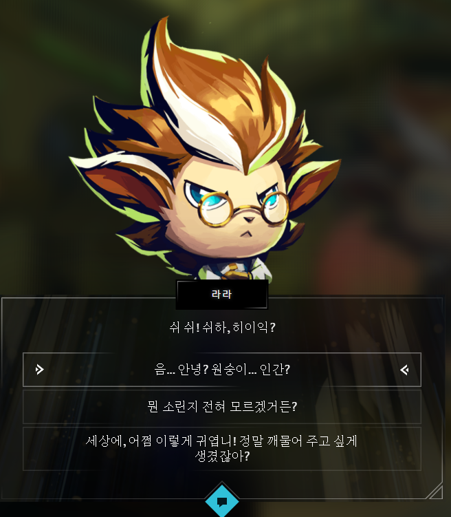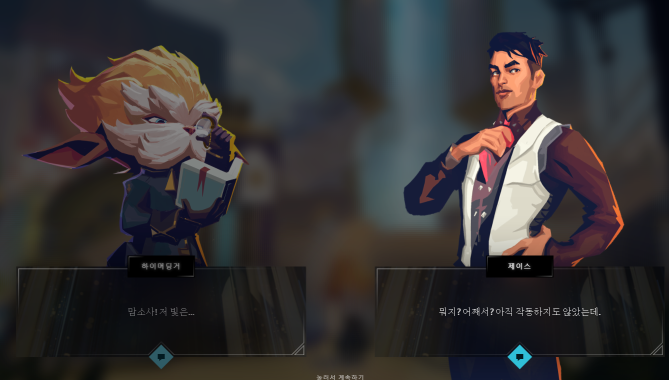 그러면 하이머딩거, 제이스, 빅토르의 대화가 쭉 등장하고 중간중간 선택지들이 주어집니다. 하지만 선택지들은 사실 결과에 아무런 영향이 없기 때문에 그냥 아무거나 손 가는대로 눌러주시면 됩니다.
