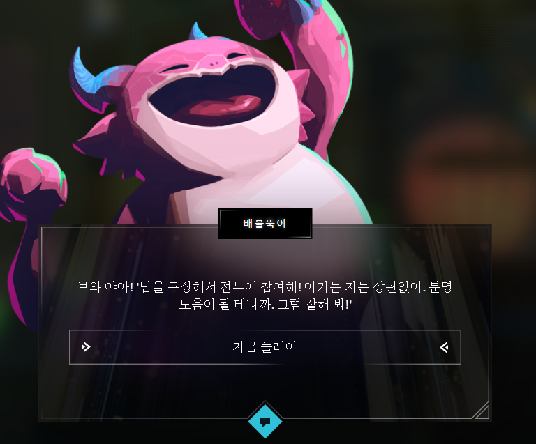 배불뚝이와 이야기를 하다보면 '지금 플레이' 버튼이 나오고 그걸 누르면 롤토체스 공식 홈페이지로 이동됩니다. 바로 닫아주고 다시 이벤트 페이지로 돌아와 대화를 이어갑니다.