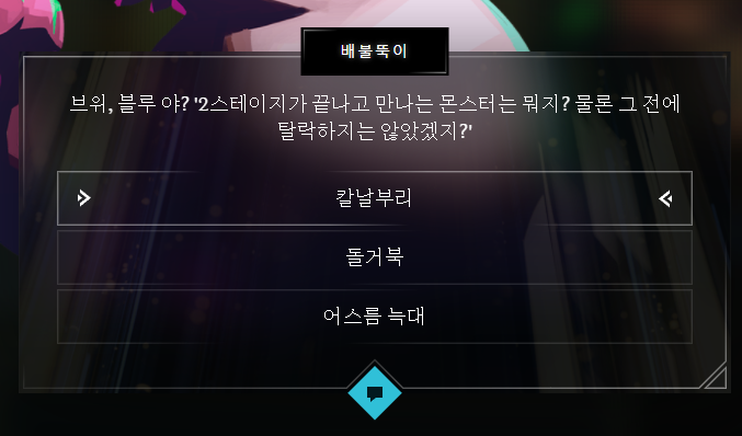 그렇게 대화를 진행하다보면 배불뚝이가 문제를 내는데 딱 이 부분만 정답을 맞춰야 됩니다. 틀려도 어차피 다시 답할 수 있기 때문에 상관 없지만 시간 단축을 위해 알려드리면 답은 '돌거북'입니다. 그렇게 대화를 하다보면 또 다른 애를 도와주라고 시킵니다.