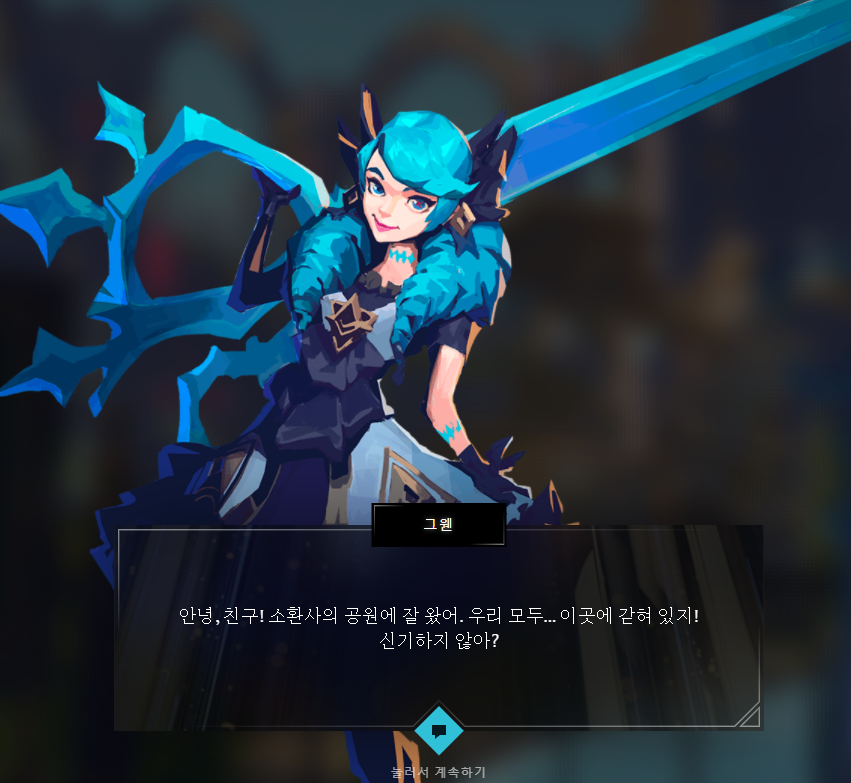 위의 지도에서 '소환사의 공원'을 클릭하여 도착하면 그웬이 말을 겁니다. 어차피 보상과는 상관 없기 때문에 마구 넘겨줍시다.