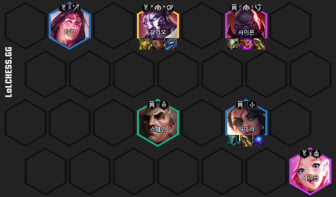 기본적으로 증강체에서 상징이나 영혼이 나오지 않았을 경우의 덱 구성입니다. 스웨인, 사미라, 타릭, 사이온, 세라핀, 갈리오 이렇게 여섯 챔피언인데요, 참고하셔야 할 점은 사이온과 갈리오는 거신 시너지로 하나당 팀 슬롯 두 개를 차지하기 때문에 완성하려면 적어도 8레벨은 찍어야 된다는 점입니다.