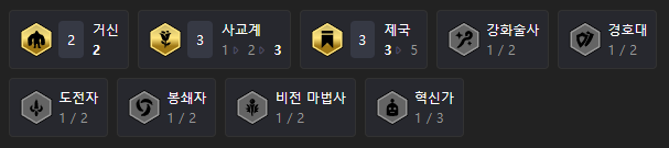상징이나 영혼이 없다는 것을 가정했을 때 덱 완성시 챙길 수 있는 시너지는 거신(2), 사교계(3), 제국(3)입니다. 여기서 제국 영혼을 얻어 제국(5) 시너지를 만들 수도 있고, 증강체에서 제국 상징 하나를, 그리고 뒤집개와 B.F 소드를 합쳐 제국 상징 하나를 더 만들어 제국(5) 시너지를 만들어줄 수 있습니다. 그 외에도 사교계 상징을 얻어 세라핀 자리에 강화술사 챔피언이나 도전자 챔피언을 넣어 강화술사(2) 또는 도전자(2) 시너지를 챙긴다던가 할 수 있습니다.