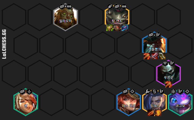 먼저 기본 구성은 일라오이, 코그모, 퀸, 갱플랭크, 미스 포츈, 우르곳, 징크스, 탐켄치입니다. 탐켄치와 일라오이가 탱커역할을 수행하며 나머지들은 다 원거리 공격 챔피언이죠. 확실히 탐켄치가 2성이 되기 전 까지는 앞열이 빈약하다는 단점이 있습니다만, 용병 시너지와 갱플랭크를 이용해 이를 빠르게 넘어가는게 관건입니다.