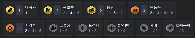 덱을 완성시키면 기본적으로 대식가(1), 쌍발총(4), 용병(5), 난동꾼(2), 저격수(2) 시너지를 얻을 수 있습니다. 여기에 3단계 증강체인 쌍발총의 영혼, 용병의 영혼, 난동꾼의 영혼, 돌연변이의 영혼 등을 이용하여 시너지를 더욱 강화할 수 있습니다.