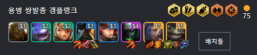 이 이외에도 교환의 장, 황금 티켓, 부익부 등 시너지도 괜찮지만 그런 증강체들은 용병 쌍발총 갱플랭크덱 뿐만 아니라 다른 모든 덱에도 좋으니 따로 작성하진 않았습니다. 이처럼 용병 또는 쌍발총 관련 증강체를 얻는게 가장 좋습니다.