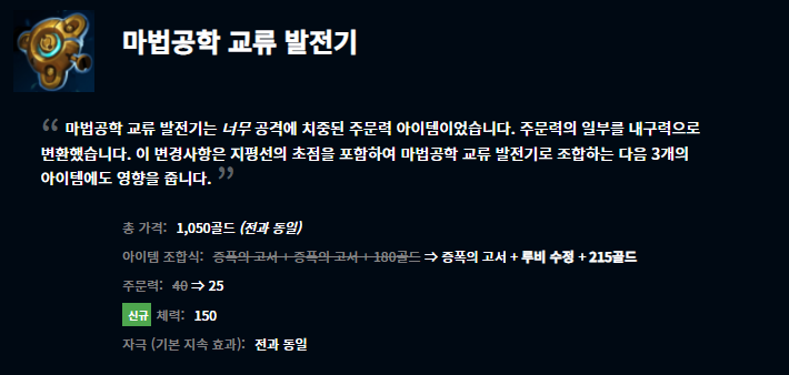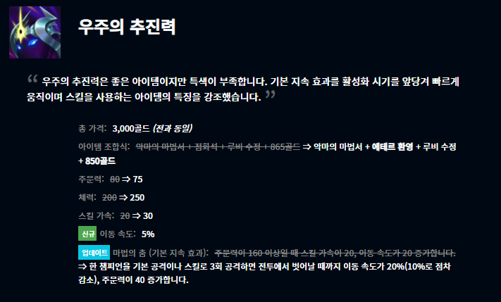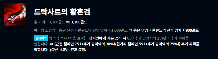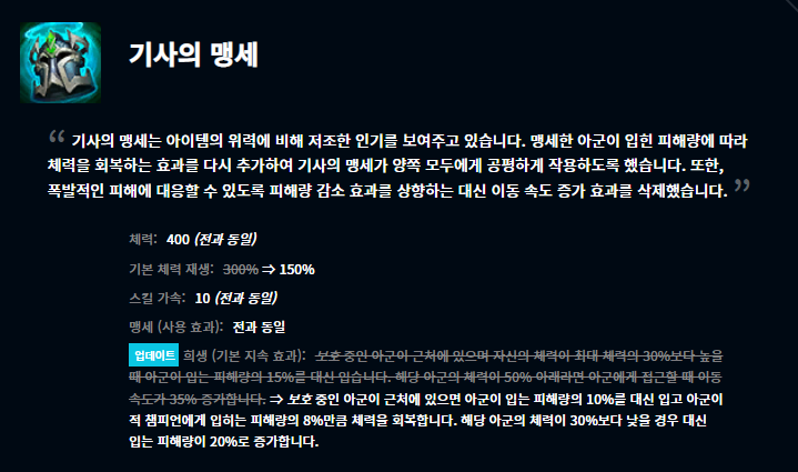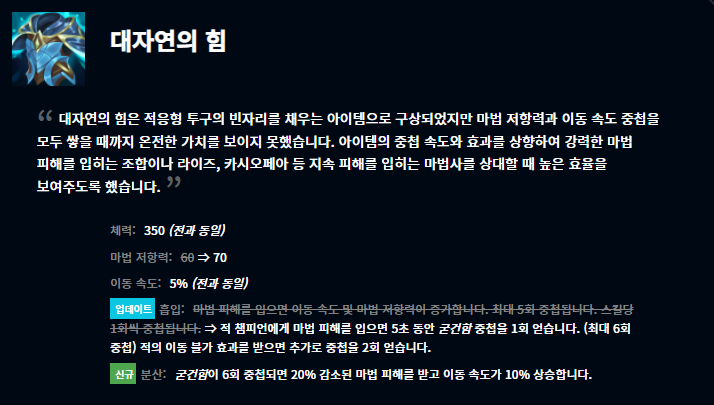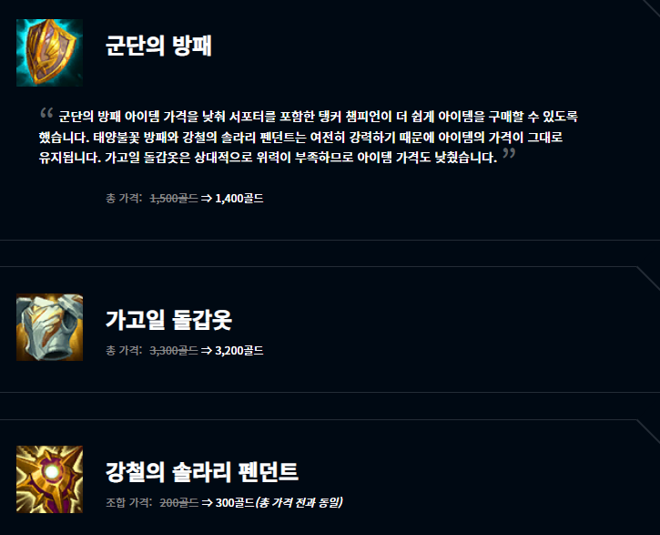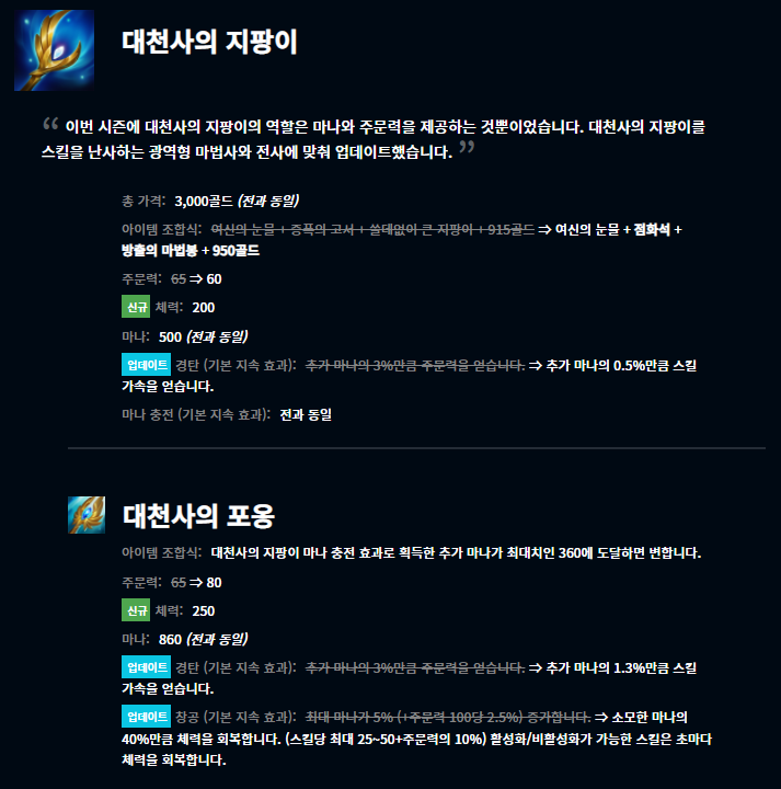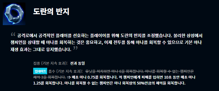 여러 변경사항들이 있는데요, 개인적으로 눈여겨 보는 것은 도란의 반지 변경사항입니다. 사실 기존 미드 메이지 챔피언들은 대부분 도란의 반지를 택하기보다는 룬에 시간 왜곡 물약을 들고 부패 물약으로 스타트를 끊었었죠. 이번 도란의 반지 패치로 이용하는 챔피언들이 더 많아질 것으로 생각됩니다. 또 여러 아이템들이 효과가 변경되었고 일부는 가격이 조정되기도 하고 하위 조합 아이템이 변경되기도 하였습니다.