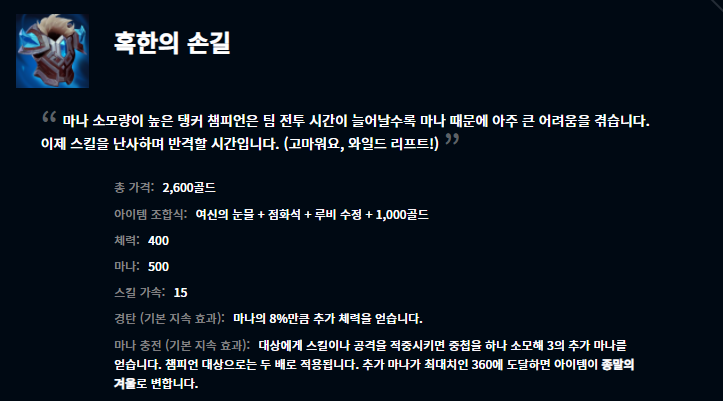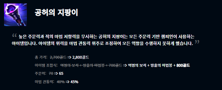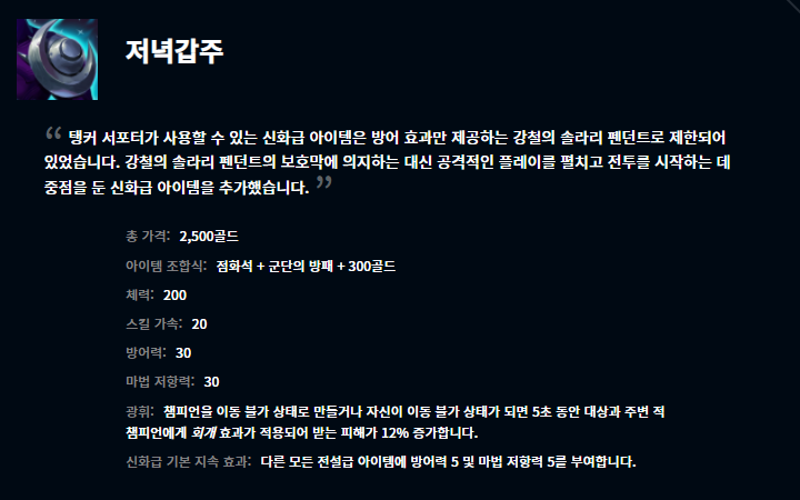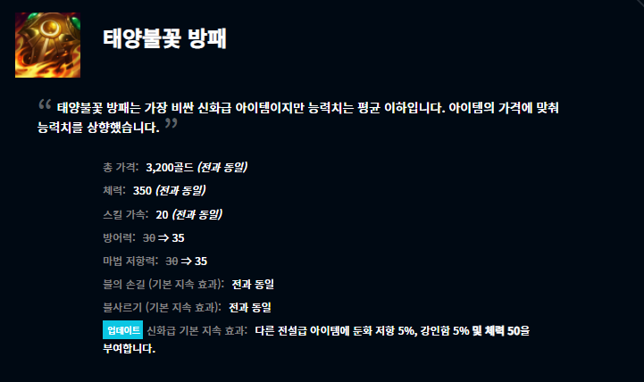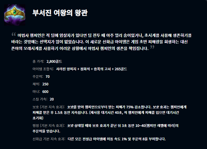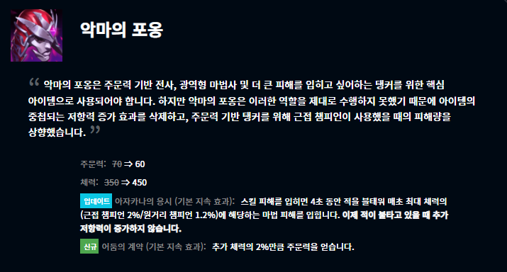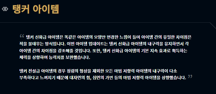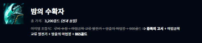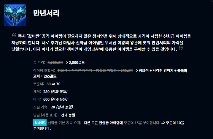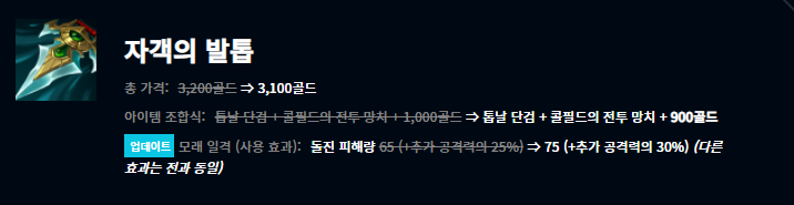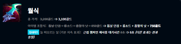 부서진 여왕의 왕관, 저녁갑주, 원칙의 원형낫, 그림자불꽃, 혹한의 손길, 종말의 겨울 아이템이 새롭게 모습을 드러냈습니다. 어떤 챔피언들이 어떤 아이템에 잘 어울리는지는 한동안 지표를 관찰해봐야 알 수 있을 것 같습니다.