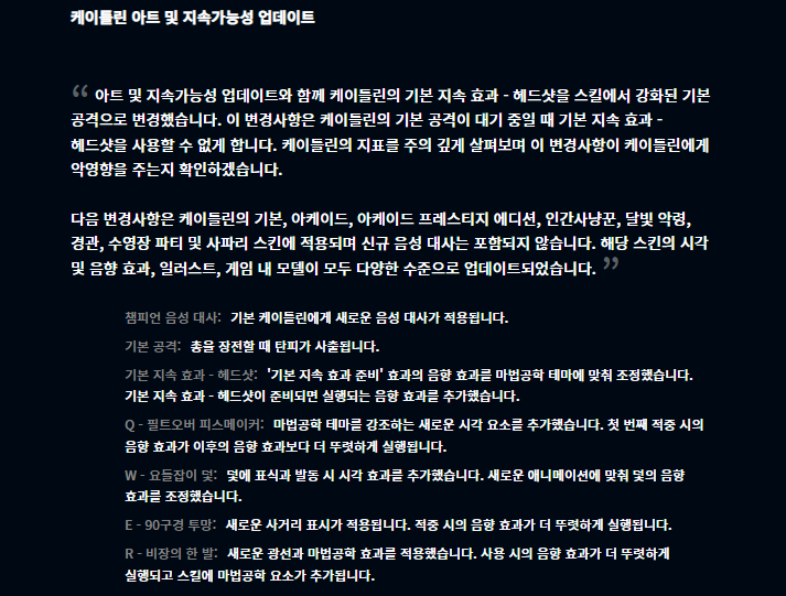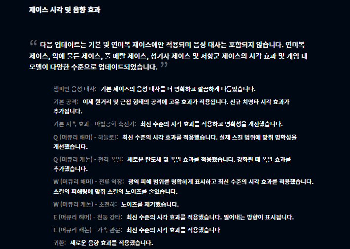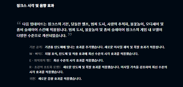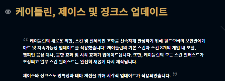 롤 애니메이션 아케인의 주역인 세 챔피언이 인게임에서 음성 대사라던가, 음향 효과라던가, 시각적 효과 등을 개선 및 적용했다고 합니다. 아케인으로 인해 정말 많은 부분이 달라지네요.