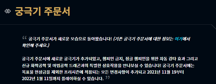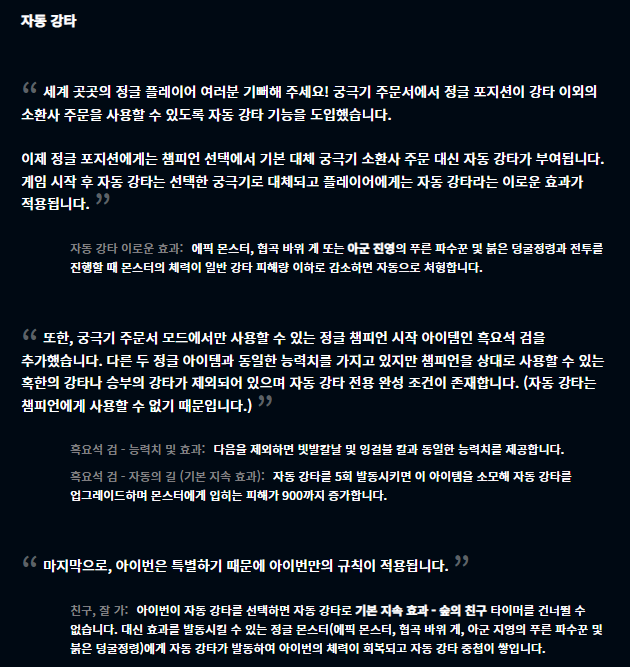 궁극기 주문서 모드가 다시 돌아왔습니다. 돌아온 궁극기 주문서 모드에는 더 많은 챔피언들의 궁극기가 추가되었으며 추가적으로 정글 라인도 정글을 제대로 돌면서 재미를 누릴 수 있게끔 자동 강타라는 스펠을 선택할 수 있습니다. 자동 강타를 들면 게임 시작 후 선택한 궁극기로 변경되며 그와 동시에 에픽 몬스터, 협곡 바위게, 블루, 레드를 상대할 때 몬스터의 체력이 강타 피해량 이하로 감소하면 자동으로 처형됩니다. 그 외에도 이번에는 신규 드래곤을 기념하여 궁극기 주문서 모드에서는 마법공학 드래곤 및 화학공학 드래곤만 등장한다고 하네요.