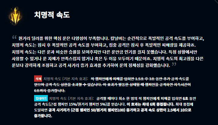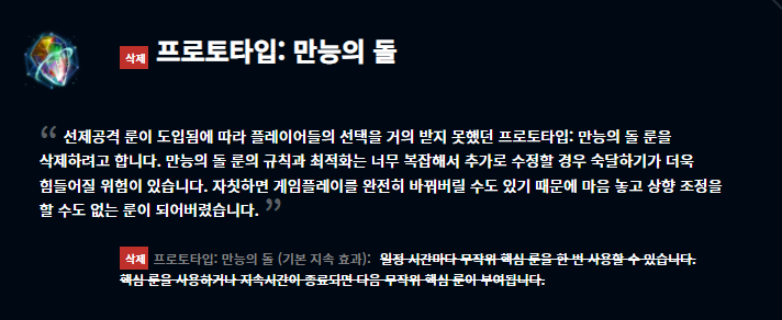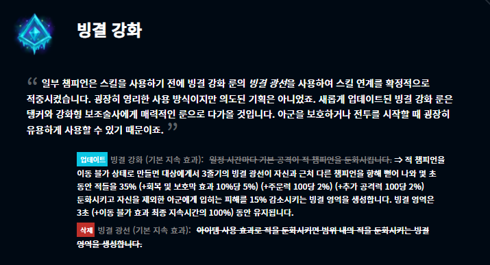 기존 만능의 돌 룬이 삭제되고 신규 룬인 선제공격이 이를 대체합니다. 선제공격 룬은 도벽룬의 부활이라는 말도 많았는데 개인적으로는 그 정도까지는 아니라고 봅니다. 더불어 빙결 강화 룬이 크게 변경되었는데요, 이제 완전 서포터 전용 룬으로 전환이 된 듯 싶네요. 브루저가 아군 챔피언을 물었을 때 해당 브루저에게 CC기를 걸어 아군을 살려주는 용도로 더 많이 쓰일 것 같습니다.