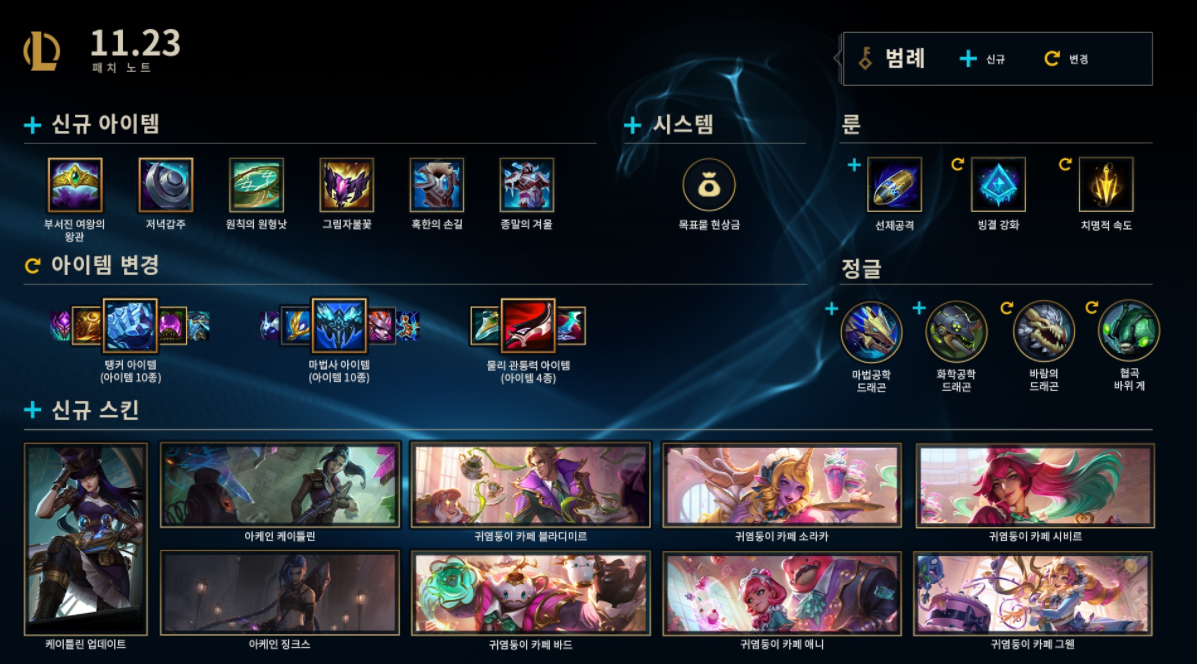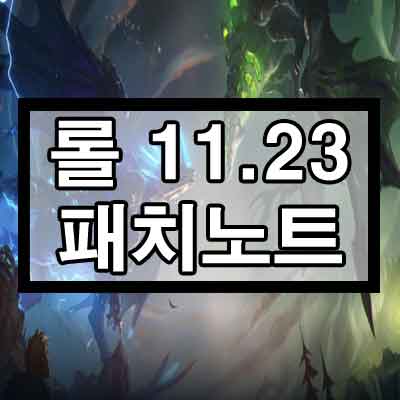 11.23 패치에서는 챔피언 버프, 너프 변경사항은 없으며 대신 신규 아이템들의 등장, 기존 아이템 밸런스 문제, 그리고 새로운 드래곤 정글 변경사항, 새로운 룬 및 기존 룬 삭제, 그 외 변경점들이 핵심입니다. 또 아케인을 기념하여 징크스와 케이틀린, 제이스의 인게임 시각적 이펙트와 사운드 부분 변경사항이 있습니다.