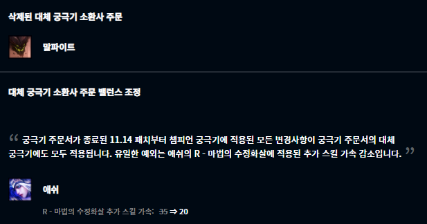 이렇게 이번 시간에는 롤 11.23 패치노트를 정리해보았습니다. 정말 많은 부분들이 변경되었다는 것을 알 수 있습니다. 매번 프리시즌때마다 나오는 이야기지만 프리시즌에 티어를 높게 달성해두변 다음 번 시즌이 시작되고 배치를 볼 때 더 MMR이 높게 잡히기 때문에 높은 티어에 안착하기가 한 층 쉬워진다는 사실 잊지 마시고 또 아케인을 기념하여 스킨 조각 3개와 전설이 알을 주는 이벤트와 그 외에 아케인 스킨 임무 이벤트도 진행중이니 놓치지 않길 바랍니다. 그러면 이번 포스팅은 여기서 마무리하도록 하고 다음번에는 또 다른 글로 다시 찾아오도록 하겠습니다. :)