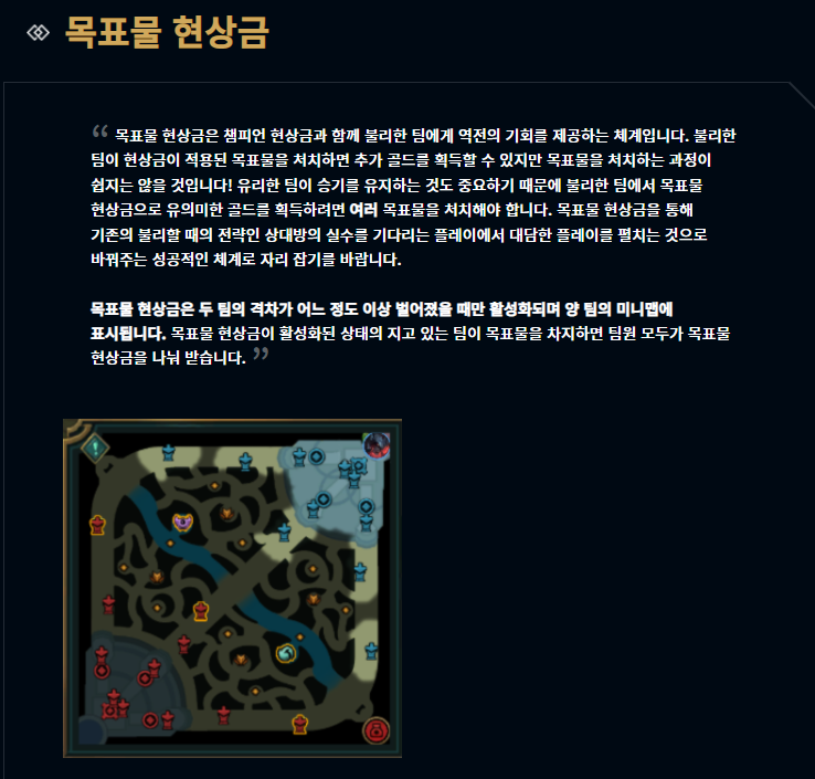 목표물 현상금은 두 팀의 격차가 일정 수준 이상으로 벌어지면 15초 후에 활성화되며, 이를 통해 불리하던 팀이 역전의 발판을 마련할 수 있게끔 됩니다. 개인적으로 목표물 현상금이 있는 상황이고 아직 희망이 보인다면 충분히 불리한 팀이 역전을 할 수 있는, 유리한 팀은 끝까지 방심하지 못하는 그런 긴장감 넘치는 게임이 되지 않을까 싶네요.