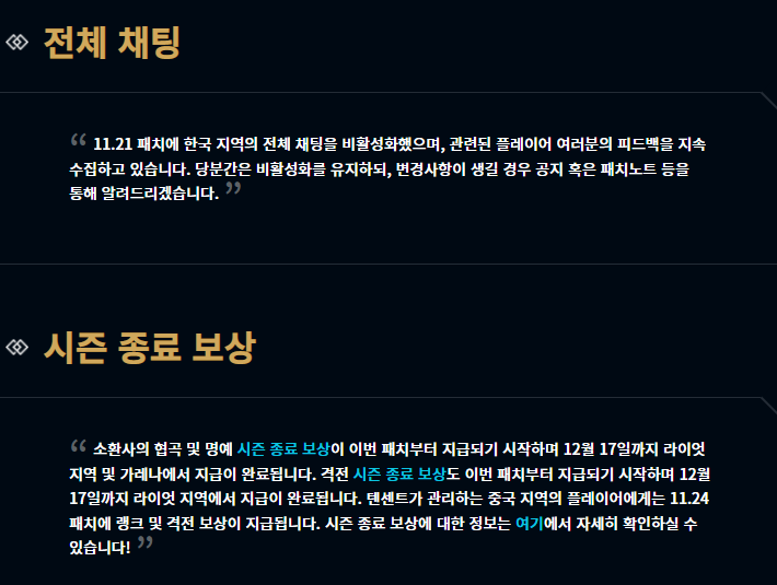논란이 되었었던 전체 채팅은 현재까지도 막혀있는 상황이며 계속해서 피드백을 수집하고 있다고 합니다. 변경사항이 생기는 경우 공지나 패치노트 등을 통해 안내하겠다고 하며, 또한 시즌 종료 보상이 지급되기 시작하며 12월 17일까지 지급이 완료된다고 하네요.