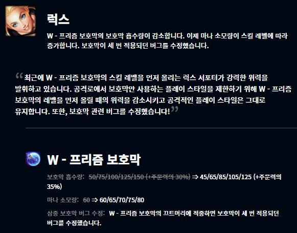 | 럭스 | W스킬 보호막 흡수량 50/75/100/125/150(+주문력의 30%) -> 45/65/85/105/125(+주문력의 35%) W스킬 끄트머리에 적중하면 보호막이 세 번 적용되었던 버그 수정 |
