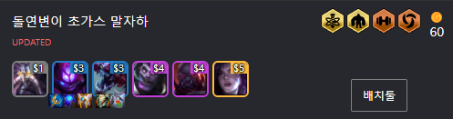 게임 시작 크립에서 말자하나 초가스가 나오면 올려볼만한 덱이며 돌연변이 시너지의 경우 매 판마다 효과가 달라지기 때문에 이를 참고해서 나중에 추가적인 시너지를 어떻게 챙길지 결정하는 것이 좋습니다. 돌연변이 시너지가 나무 정령, 암흑의 별, 마나 감소일때 더더욱 좋은 덱이며 7레벨에는 돌연변이(5)가 완성되어야하고 초가스, 말자하 3성작을 노려줍니다. 3성이 되느냐 안되냐에 따라 승률이 크게 달라지기 때문이고, 3성작을 끝냈다면 8렙에 유동적으로 시너지를 추가로 맞춰주면 됩니다.