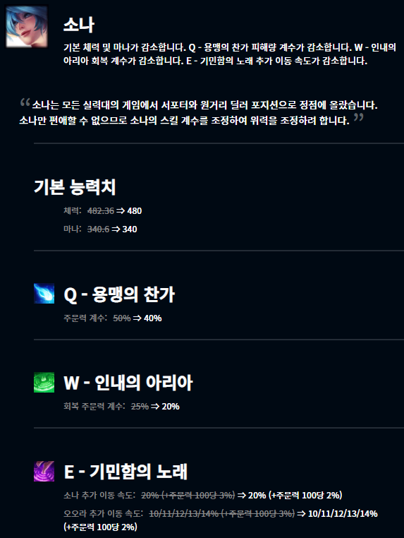| 소나 | 기본 체력 482.36 -> 480 기본 마나 340.6 -> 340 Q스킬 주문력 계수 50% -> 40% W스킬 회복 주문력 계수 25% -> 20% E스킬 추가 이동속도 20%(+주문력 100당 3%) -> 20%(+주문력 100당 2%) 오오라 추가 이동 속도 10/11/12/13/14%(+주문력 100당 3%) -> 10/11/12/13/14%(+주문력 100당 2%) |