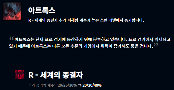 | 아트록스 | R스킬 추가 공격력 계수 20/25/30% -> 20/30/40% |