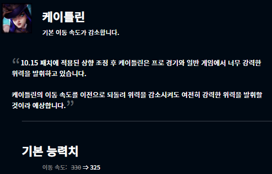 | 케이틀린 | 기본 이동속도 330 -> 325 |