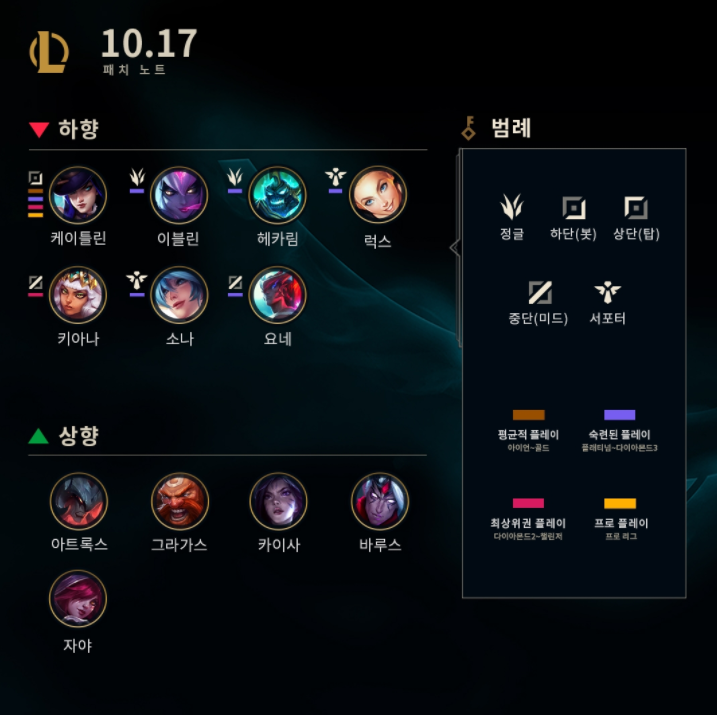 우선 롤 10.17 패치노트에 의하면 아트록스, 그라가스, 카이사, 바루스, 자야가 상향되었으며 케이틀린, 이블린, 헤카림, 럭스, 키아나, 소나, 요네가 하향되었습니다. 그렇다면 어떤 점이 상향인 것이고 어떤 점이 하향인 것인지 한번 알아보겠습니다.