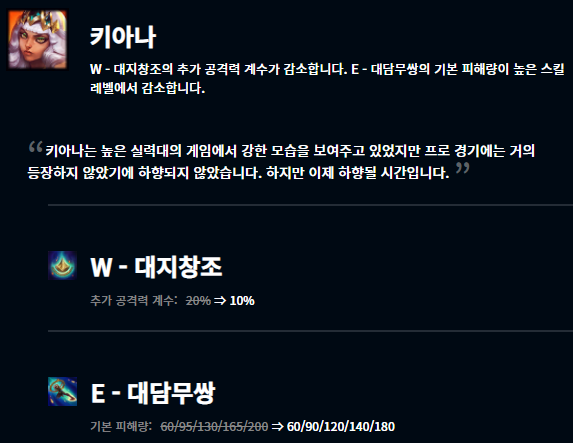 | 키아나 | W스킬 추가 공격력 계수 20% -> 10% E스킬 기본 피해량 60/95/130/165/200 -> 60/90/120/140/180 |