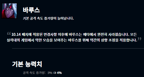 | 바루스 | 기본 공격속도 증가량 3% -> 4% |