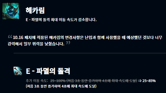| 헤카림 | E스킬 추가 이동속도 25~100% -> 25->85% |